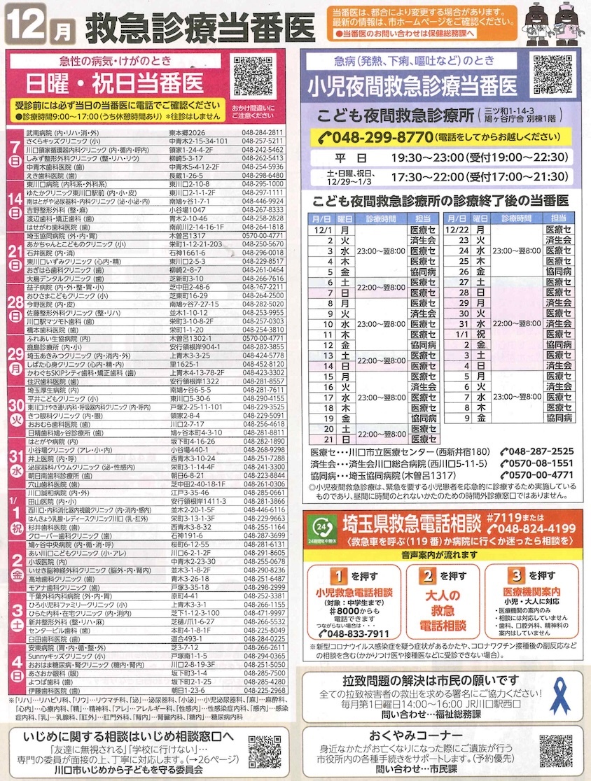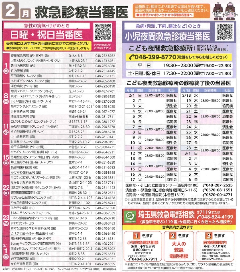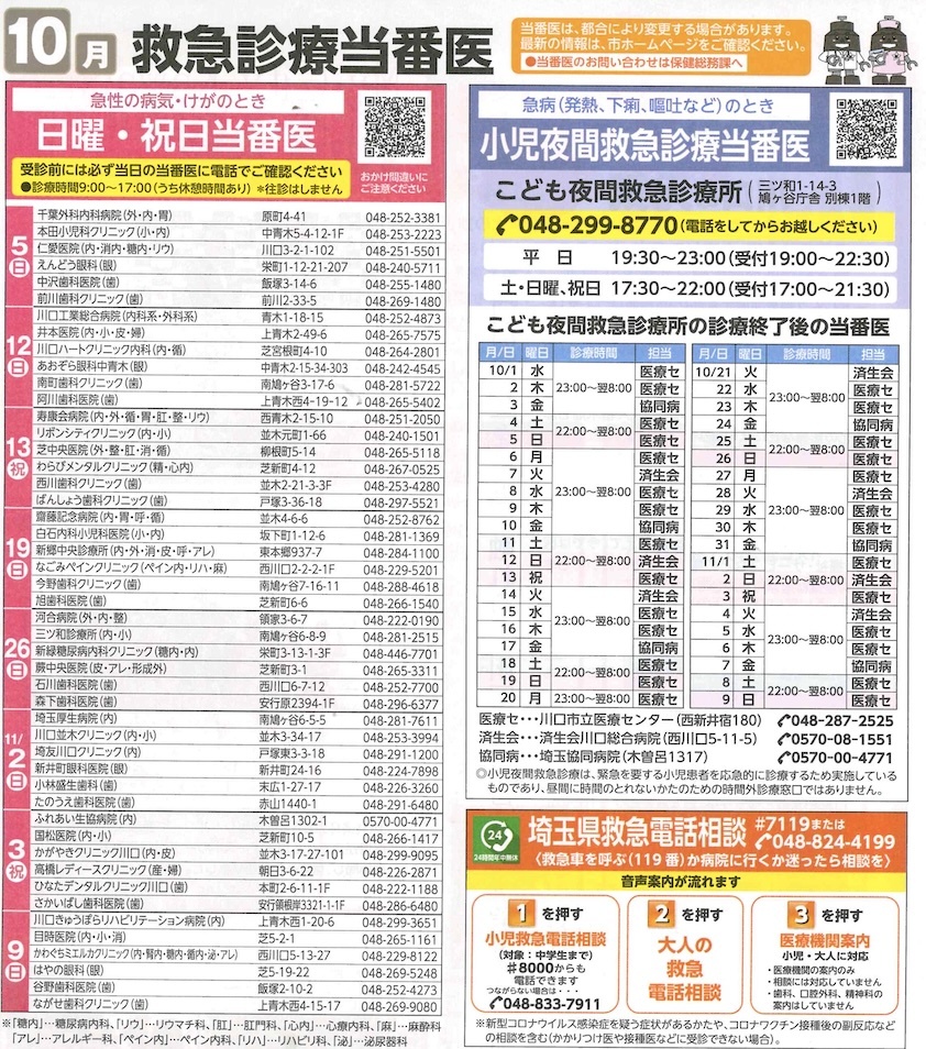 日/祝日の9:00〜17:00は、各クリニックでの輪番(交替)制になっています(下記左参照)。それ以降(平日23:00〜、土/日/祝日22:00〜)の救急診療は、川口市立医療センター、済生会川口総合病院、埼玉協同病院の輪番制になっています(下記右参照)。